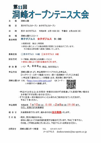 第11回洞峰オープンテニス大会を開催いたします。