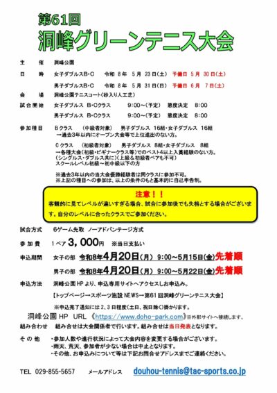 「第61回 洞峰グリーンテニス大会(男子の部)」を開催いたします。